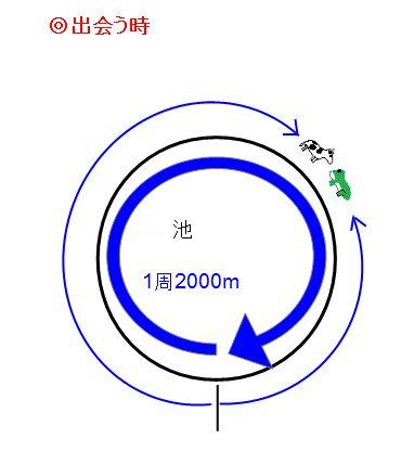 - 2人が池の周りを逆方向に回って、途中で出会う