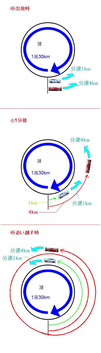 と、覚えてしまう人もいます。しつこいと思われるかもしれませんが、そのまま暗記してしまうのはおすすめしません。 それでは、池の周りを同じ向きに回って途中で追い抜く旅人算をまとめます。