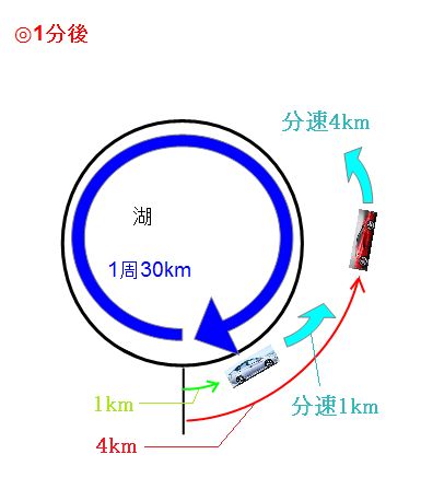 追い越すまでの時間がわからないので、フェラーリとプリウスそれぞれが走った道のりはわからないのですが、図を見れば、フェラーリの方がプリウスよりも湖1周分(30km)多く走っているのがわかります。 続いて、スタートしてから1分後の状況を確認します。