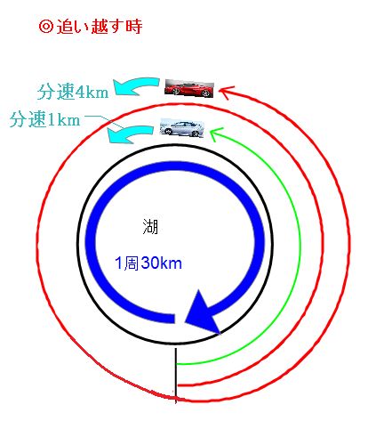 すみません、出会う旅人算とまったく同じです。続いて、池の周りを同じ向きに回って途中で追い抜く旅人算の解き方を考えてみましょう。