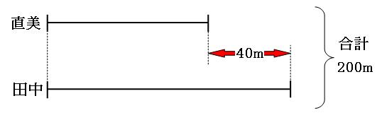 今日は直美と田中さんは同じ方向に回っています。直美は45分で周回遅れにされますので、45分間で田中さんの方が1800m多く歩いたことになります。1分当たりを求めると、