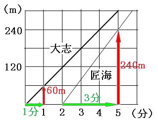 大志は1分間に60m、匠海は1分間に80m進むので、1分間で20mづつ引きはなしていくのが分かります。よって、12m引きはなすのにかかる時間は、