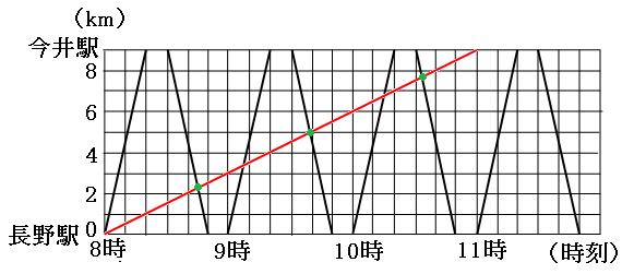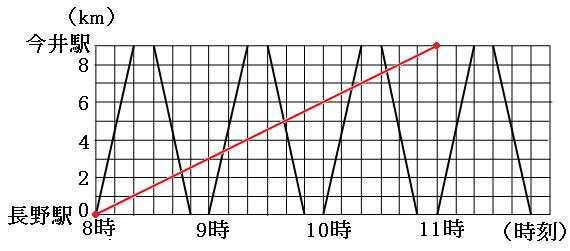 つまり、11時ぴったりに今井駅についたことになります。なので、8時ちょうどに長野駅の点と、11時ちょうどに今井駅の点を定規で結ぶと、