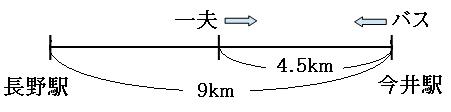 次に、バスが今井駅を出発する9時30分の状況を考えてみましょう。バスは今井駅にいます。一夫は出発してから1時間30分歩いていますので、その間に歩いた道のりは、