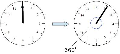 12時ちょうどのとき、長針と短針の間の角度は0°です。次に重なるまでに(1時5分頃)、長針は短針を360°追いこさなければなりません。