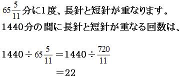 1分間で長針は短針を5.5°ずつ追いこすので、360°追いこすのにかかる時間は、