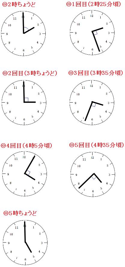 (基本問題5)午後2時から午後5時の間に、長針と短針が直角になるのは何回あるでしょう。