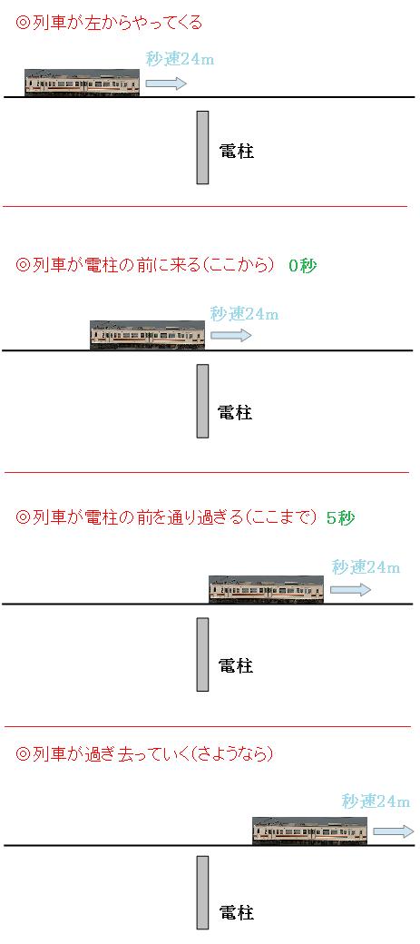 列車が左からやってきて、右に通り過ぎて行くまでの順を追うと図のようになります。続いて列車の先頭が電柱の前に来た瞬間と、列車の最後尾が電柱の前を通り過ぎて行く瞬間を並べてみましょう。