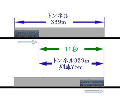 図のように、列車が実際に走った道のりはトンネルの長さよりも列車の長さ分短いので、