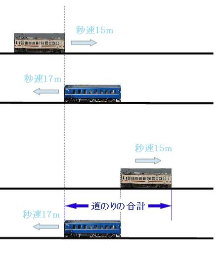 上り電車は秒速15mなのでこの1秒間で15m進み、下り電車は秒速17mなのでこの1秒間で17m進みます。 したがって、図のようにこの1秒間で「15m+17m=32m」すれ違ったことになります。 ふたつの列車は、合わせて480mすれ違わなければならなかったので、すれ違いにかかる時間は、