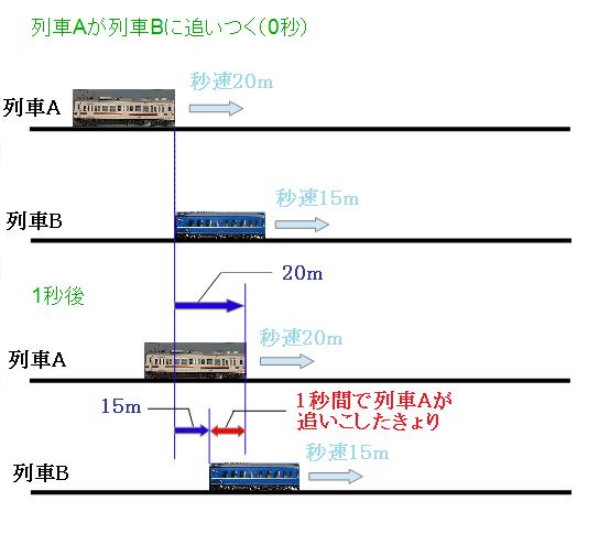 それでは、列車Aが列車Bに追いついてから1秒後の状況を見てみましょう。ここの図だけ、カメラを固定して書いてみます。
