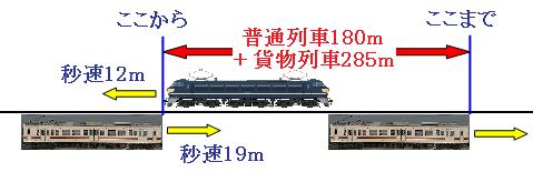普通列車は1秒間に19m、貨物列車は1秒間に12m進むので、1秒間にすれ違う道のりは、