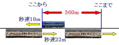 特急列車は1秒間に22m、普通列車は1秒間に18m進むので、1秒間にすれ違う道のりは、