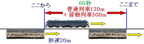 普通列車は1秒間で20m進みますので、貨物列車が1秒間で進む道のりは、