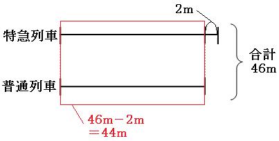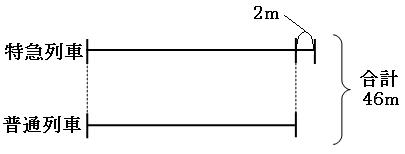 つまり、特急列車と普通列車が1秒間に進む道のりの和は46mです。