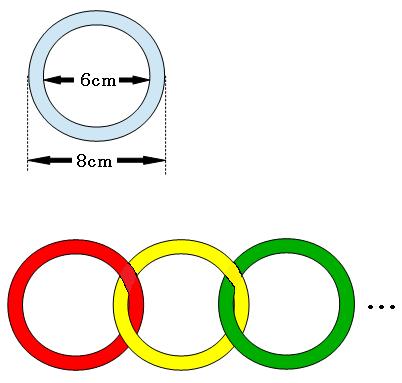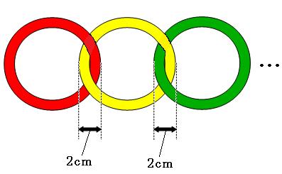 ですが、実際には重なっている部分があるので、全体の長さはこれよりも短くなります。まっすぐ並んでいるので、重なっている部分の数はリングの数よりも1つ少なくなっています。