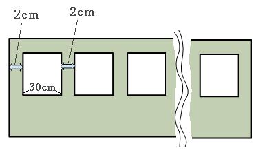 廊下の掲示板に、横30cmのプリントを10枚、横にはっていきます。 掲示板の端からプリントまでの間も、プリントとプリントの間もすべて2cmずつ空けるとすると、掲示板の横の長さは何cmでしょう。