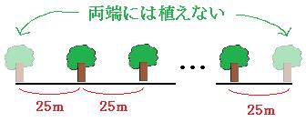 もしも道の両端にも木を植えたら、木は何本必要でしょう。木はまっすぐ並んでいるので、木の本数は木の間の数よりも1つ多いです。