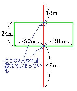 ただし、この考え方だと、緑の長方形と赤い直線が交わっている部分に立っている人を2回数えてしまっていることになります。なので、この2人分は引いておきます。