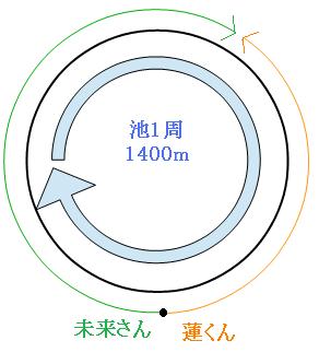また、同じ方向に歩くと70分後に未来さんが蓮くんを追い抜いた(1周遅れにした)ということは、70分間で未来さんのほうが蓮くんよりも1400m(池1周分の道のり)多く歩いたということになります。