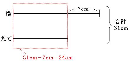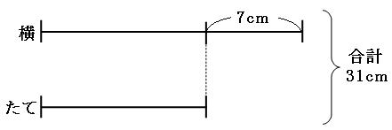 線分図を見ると、これは長方形のたての長さです。横の長さはたてよりも7cm長いので、