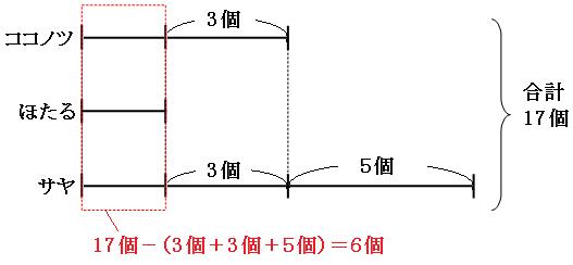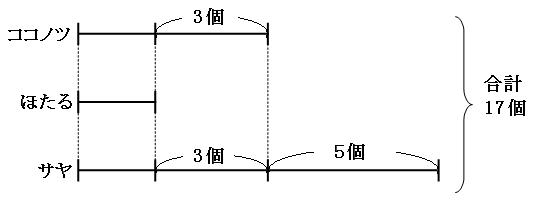 ココノツくんが取ったおはじきの数は、ほたるさんが取ったおはじきの数よりも3個多く、サヤさんが取ったおはじきの数は、ココノツくんが取ったおはじきの数よりも5個多く、3人合わせて17個のおはじきを取りました。