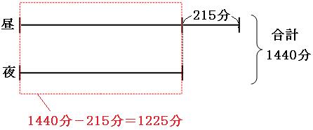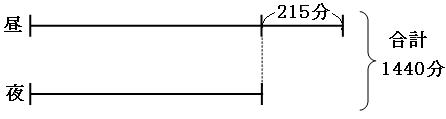 昼と夜の差は215分、和は1440分なので、線分図を書いてみると、